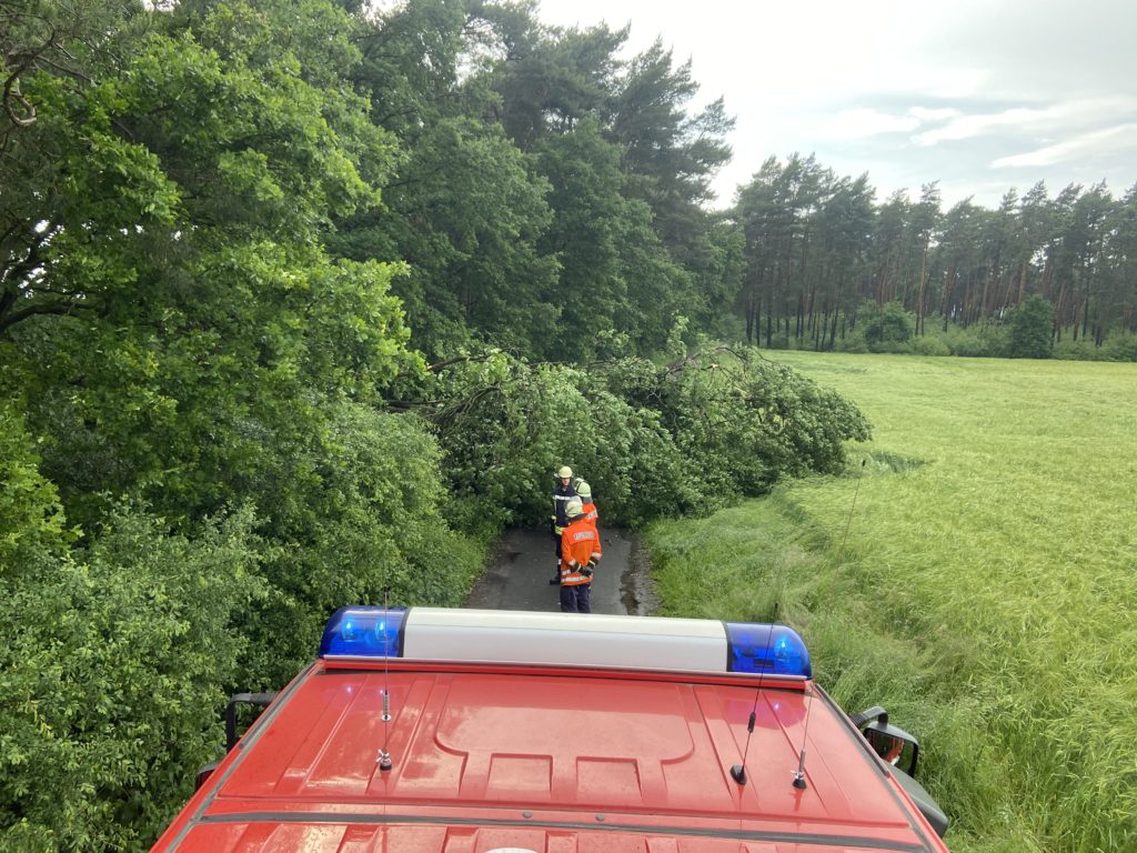 Westlich des Osterfeuerplatzes ist eine Eiche auf die Straße gekippt. Mittels Kettensägen wurde diese zerkleinert und die Straße gereinigt.